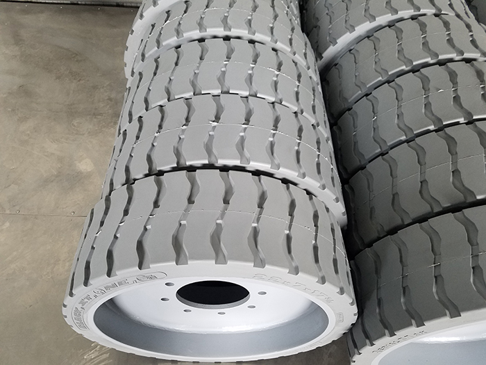 將堆高機實心輪臉麵,然後將堆高機內輪全吊起,將螺孔對準個螺栓,放下內輪銅並檢查內輪銅已放貼實,裝入螺母到栓頭部,然後用8-10公斤風炮機或氣動衝擊扳,手預擰緊到硬接觸;使用810公斤風炮機或扭矩扳手順時針、交錯、對稱分多次次擰緊輪轂母,直至全部達到力矩標準